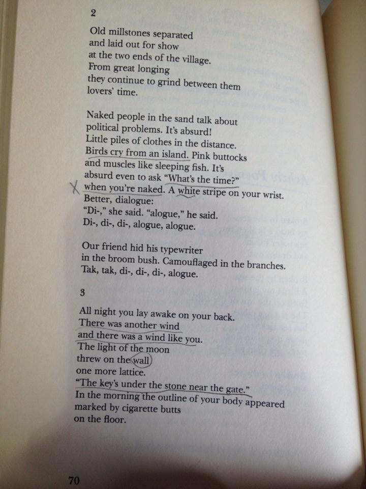 Lack of completeness is hinted; on the surface the stories are idyllic expressions of love framed by staples of romantic convention, rain, sun, spring, flowers, grass, and the full moon. The woman’s body is “full of lizards, they all love sun” her eyes, breasts and things compose the sensual picture and complement the earth images providing the cycle’s setting. On the surface, peace and tranquility accompany unconditional and perfect love, yet notes of unease penetrate the harmony of body and nature, the hint of conflict about what is only an act of love, not perfect love itself: