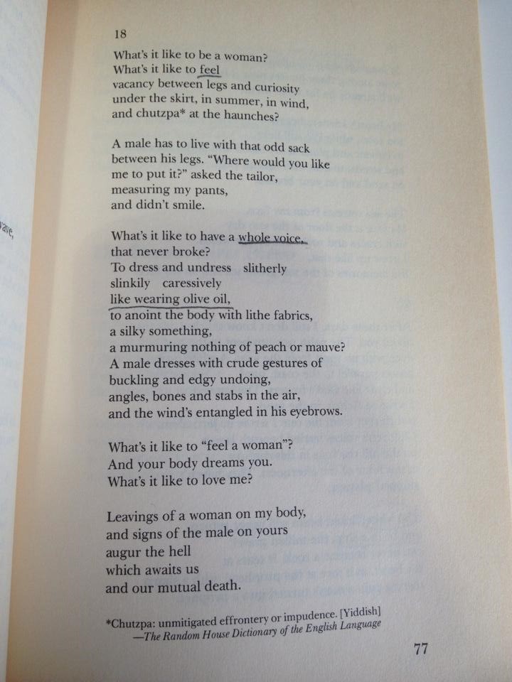 The “I “does not speak to the beloved in the sense of courtship or flattery. The female partner is described through extravagant images but they serve often to distance her, as if the hyperbole dehumanizes rather than endears her.