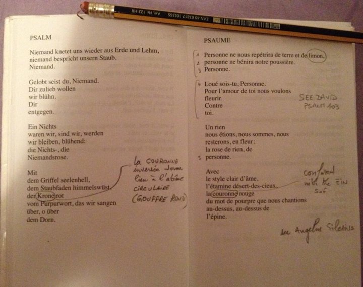 Ce poème de Celan, évoque certainement le psaume 103 de David..Néanmoins, au premier abord les mots tels que : néant, fleurir.. rappelle Heidegger, chez qui l’être est ce qui fait surgir l’étant du néant, il fait de la rose.. Mais c’est toujours au moment ou Celan semble le plus proche de Heidegger qu’il s’en tient le plus éloigné. Celan ne renonce jamais au sujet, celui la ne subit pas un destin qui lui advient de l’être. Le vouloir fleurir est un fleurir contre.